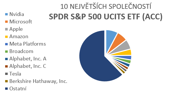 Největší společnosti v ETF: Nvidia (7,76 %), Microsoft (6,88 %), Apple (6,33 %), Amazon (3,95 %), Meta Platforms (2,93 %)