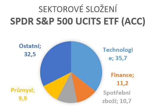 Sektorové složení: Technologie 35,7 %, Finance 11,2 %, Spotřební zboží 10,7 %, Telekomunikace 9,9 %, ostatní 32,5 %.