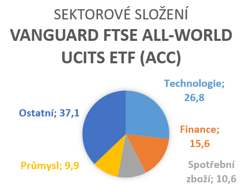 Sektorové zastoupení: Technologie 26,8 %, Finance 15,6 %, Spotřební zboží 10,6 %, Průmysl 9,9 %.