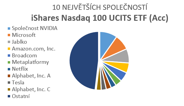 Největší společnosti v ETF (váhy): Nvidia (9,7 %), Microsoft (8,6 %), Apple (7,9 %), Amazon (5,5%), Broadcom (5,2%)